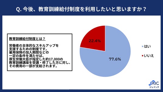 教育訓練給付制度を「知らない」と回答した方に、『教育訓練制度』の概要を説明した上で、「今後、教育訓練給付制度を利用したいと思いますか」と質問したところ、「はい」が77.6%、「いいえ」が22.4%となり、制度を認知することで、利用への関心が大きく高まる傾向が見受けられました。