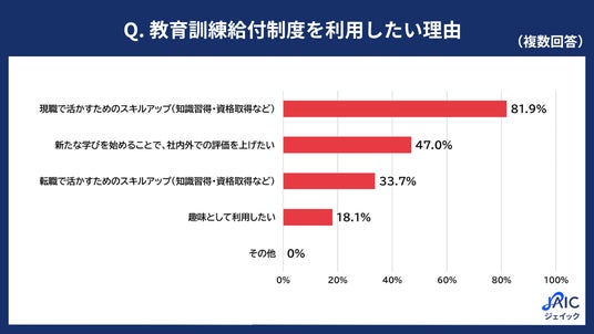 教育訓練給付制度を「知らない」人のうち、「今後、利用したい」と回答した方に、「利用したい理由」を質問したところ、「現職で活かすためのスキルアップ(知識習得・資格取得など)」が81.9%、「新たな学びを始めることで、社内外での評価を上げたい」が47.0%、「転職で活かすためのスキルアップ(知識習得・資格取得など)」が33.7%、「趣味として利用したい」が18.1%、「その他」が0%となりました。