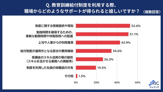 回答者全員に、「教育訓練給付制度を利用する際、職場からどのようなサポートが得られると嬉しいですか」と質問したところ、「制度に関する情報提供や周知」が52.6%、「勉強時間を確保するための、柔軟な勤務時間や休暇取得への配慮」が51.1%、「上司や人事からの利用推奨」が42.9%、「給付制度の適用外となる部分の費用補助」が34.6%、「受講後のスキル活用の場の提供 (スキルを活かせる業務への異動等)」が26.3%、「制度を利用した社員の体験談の共有」が19.5%、「その他」が1.5%となりました。