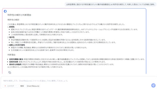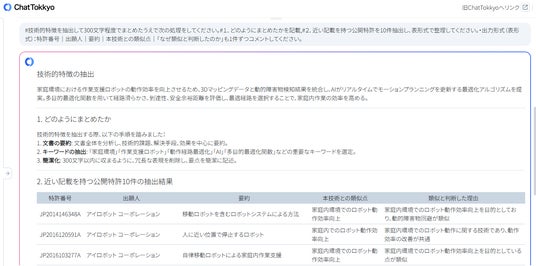 MyTokkyo.AiのChatTokkyo機能により、先行特許との差分分析や請求項構成の自動整理を実施。従来2~3週間を要していた特許検討プロセスを約5日間に短縮した。AIが家庭環境の特徴量(家具配置・床傾斜・照度)とロボット経路最適化パラメータの相関を自動解析し、発明の進歩性を定量的に示すことに成功した。
