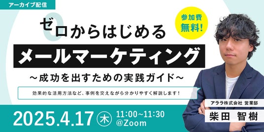 ペイクラウドホールディングス株式会社(東証グロース:4015)の傘下で各種ITソリューション事業を展開するアララ株式会社(本社:東京都港区、代表取締役社長:門倉 紀明)は、株式会社東京海上日動パートナーズTOKIO(本社:東京都渋谷区、代表取締役:豊田 晃)と共催で2025年2月・3月に開催したWebセミナー「ゼロからはじめるメールマーケティング~成果を出すための実践ガイド~」のアーカイブ配信を2025年4月17日(木)に実施することをお知らせいたします。