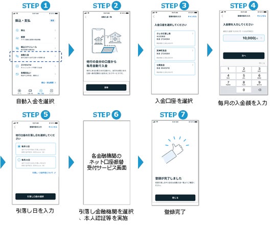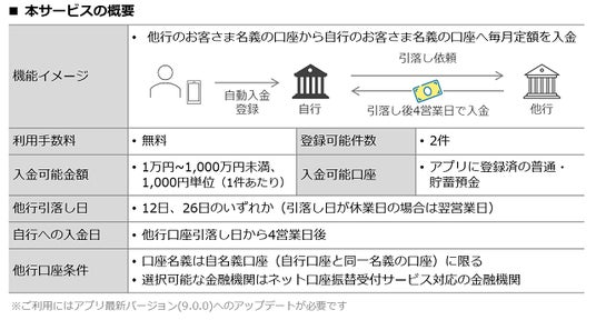 本サービスでは、利用手数料不要かつアプリで一度登録すれば毎月自動で資金移動がおこなわれるため、これまでの手続負荷や手数料負担を解消するとともに、お客さまによる期日管理も不要となります。給与振込等がいずれの銀行であっても、自行の商品・サービスをより安心かつ便利にご利用いただけます。