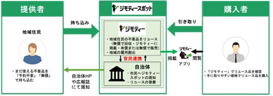 ジモティースポットは、「不要になったけれどもまだ使えるモノ」を地域のコミュニティ内で譲り合うことができるサービスです。持ち込み希望の方は、ジモティースポットに持ち込むだけで、手軽に必要とする人に譲渡することができます。そして、譲り受け希望の方は、持ち込まれたモノの情報を地域の情報サイト「ジモティー」で検索し、ジモティースポットで引き取ることでマッチングが成立する仕組みとなっています。