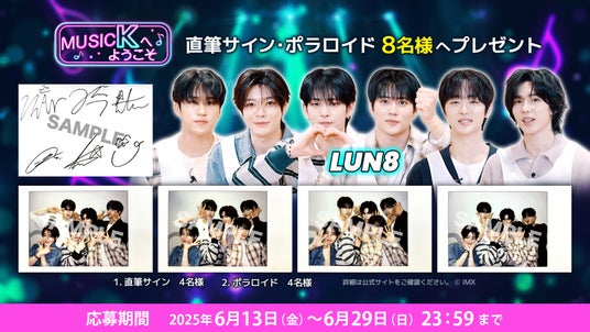 「Music Kへようこそ!」最新話更新を記念して、LUN8の直筆サインとポラロイドが抽選で8名様に当たる豪華プレゼント企画を本日18時より実施。Music Kの公式X、および公式サイトをご確認のうえ詳細をお待ちください。