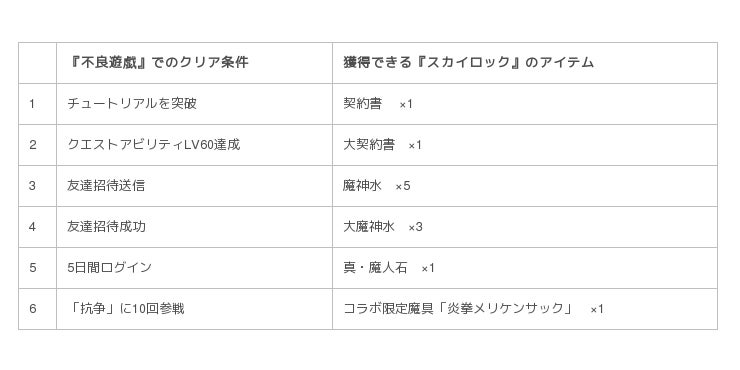 期間中、『スカイロック』、『不良遊戯』それぞれのゲーム内で指定されたミッションをクリアすることで、『スカイロック』ではコラボ限定魔具、『不良遊戯』ではSR以上確定チケットなどの報酬アイテムをプレゼントいたします。