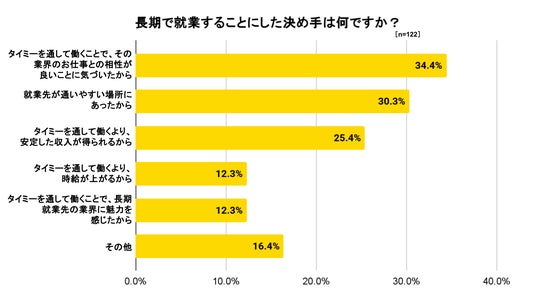 長期で就業することにした決め手としては、「その業界のお仕事との相性が良いことに気づいたから(34.4%)」が最も多くなりました。現役時代には気づかなかった未経験のお仕事との相性をスポットワークを通じて知ることが、新しい仕事を始めるきっかけになったものと思われます。