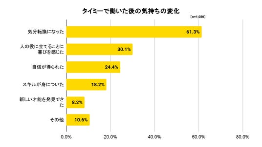 タイミーで働いた前後の気持ちの変化としては、「気分転換になった(61.3%)」が最も多く、「人の役に立てることに喜びを感じた(30.1%)」「自信が得られた(24.4%)」と続きました。また、「その他」と回答した人のフリーアンサーには以下のような回答が寄せられています。