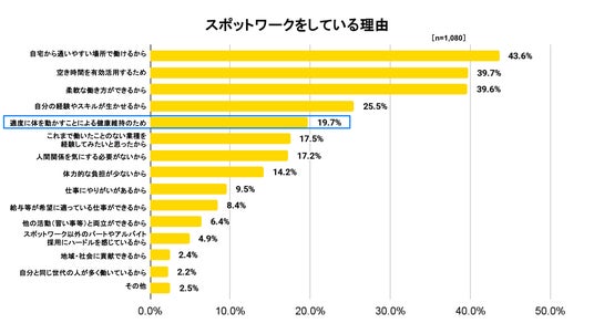 シニア世代の働き手がスポットワークをしている理由としては、「自宅から通いやすい場所で働けるから(43.6%)」「空き時間を有効活用するため(39.7%)」「柔軟な働き方ができるから(39.6%)」が上位に続きました。履歴書や面接が不要なスポットワークでは、自分の条件にあった柔軟な働き方を、ある程度実現できているものと思われます。また、「適度に体を動かすことによる健康維持のため(19.7%)」も2割程度の人が該当すると回答していました。
