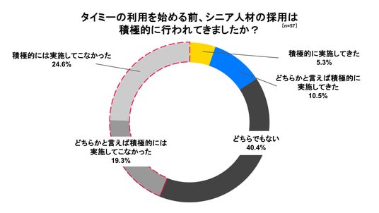 タイミーの利用を始める前、シニア人材の採用の実施有無について、「積極的には実施してこなかった」は24.6%、「どちらかと言えば積極的には実施してこなかった」は19.3%と、シニア採用に積極的でなかった事業者は全体の43.9%を占めました。