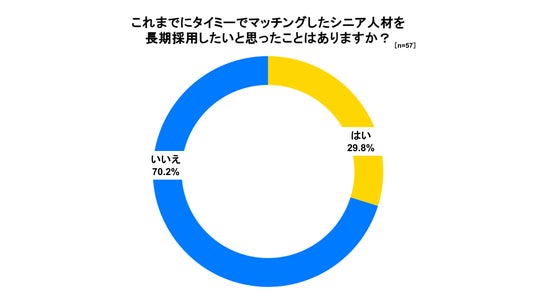 また、「タイミーでマッチングしたシニアの働き手を長期採用したい」と思った事がある事業者は29.8%いることが分かりました。これは、前問で「積極的に実施してきた」「どちらかと言えば積極的に実施してきた」と回答した15.8%を、14pt上回ります。これまではシニア人材の採用に積極的でなかったものの、タイミーの利用を通じて、年齢を理由とせずに人材を採用したいと思うようになった事業者がいることがうかがえます。