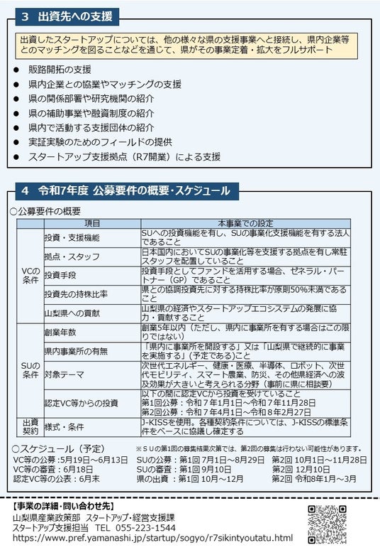 山梨県(知事:長崎 幸太郎)は、ベンチャーキャピタル(以下「VC」という。)と連携体制を構築し、その投資活動と協調して主にシード~アーリー初期におけるスタートアップの資金調達を支援することにより、スタートアップを誘致・育成するとともに、山梨県内スタートアップへの投資の流れを創出することを目的として、令和5年度から、資金調達サポート事業を実施しています。このたび、次のとおり令和7年度事業のスタートアップの公募を開始いたしますので、お知らせいたします。なお、応募にあたっては、以下の認定VCのいずれかより出資を受ける必要があります。