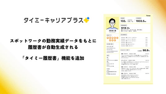 株式会社タイミー(所在地:東京都港区、代表取締役:小川 嶺)は、正社員としての長期就業を支援する「タイミーキャリアプラス」において、スポットワークサービス「タイミー」を通じた勤務実績データをもとに履歴書が自動生成される「タイミー履歴書」(※1)機能を追加しました。