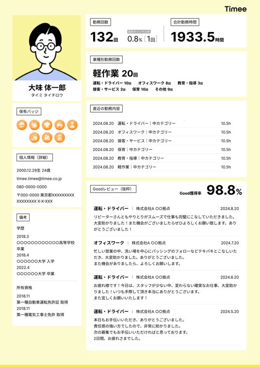 今回新たに追加された「タイミー履歴書」は、正社員としての就業支援サービス「タイミーキャリアプラス」において利用可能な機能です。「タイミーキャリアプラス」を通じた選考過程において、スポットワークサービス「タイミー」を通じた勤務実績データをもとに採用候補者の履歴書が自動で生成されます(※3)。「タイミー履歴書」には、「タイミー」を通じて勤務した回数や総勤務時間、勤務した業種のほか、事業者からのGood率やレビュー、保有しているバッジ(※4)など、採用候補者がスポットワークを通じて蓄積した勤務実績が客観的なデータとして可視化されます。これにより、選考過程においてスポットワークにおける働きぶりが正当に評価されるようになり、採用候補者のキャリア形成を後押しします。