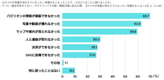 万博会場で【スマホの充電が切れそうになった/充電がなくなった】と回答した人に、充電がなくなったことでどのようなことに困ったのか確認したところ、「パビリオンの情報が確認できなかった」が69.7%とトップになりました。次いで「写真や動画が撮れなかった(62.9%)」「マップや案内が見られなかった(59.6%)」となり、中には「決済ができなかった(28.1%)」人もいたようです。