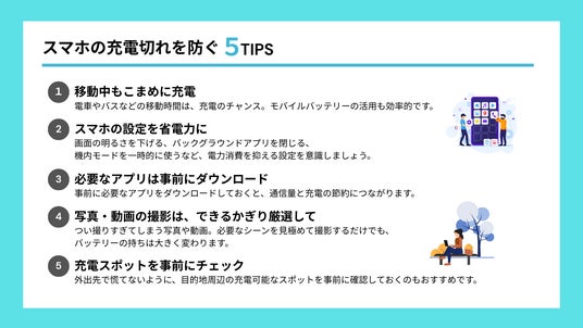 本調査では、事前に充電のために何らかの対策を行っているにも関わらず、会場内では充電に不安を感じてスマホの利用を控えた人が半数以上という結果が明らかになりました。キャッシュレス決済や会場マップの確認のほか、写真や動画の撮影などでスマホを使用するタイミングが多いからこそ、事前の充電対策には万全を期する必要がありそうです。