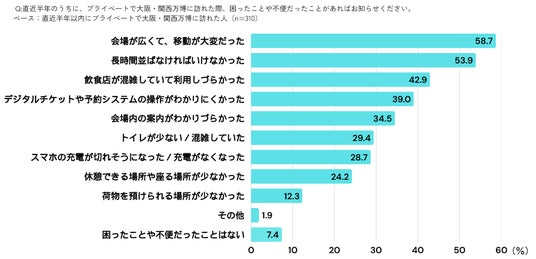 万博会場で困ったこと、不便だったことを聞いたところ、「会場が広くて大変だった(58.7%)」「長時間並ばなければいけなかった(53.9%)」「飲食店が混雑していて利用しづらかった(42.9%)」など、会場の広さ、盛況具合に起因する不便さを感じた人が多い結果となりました。