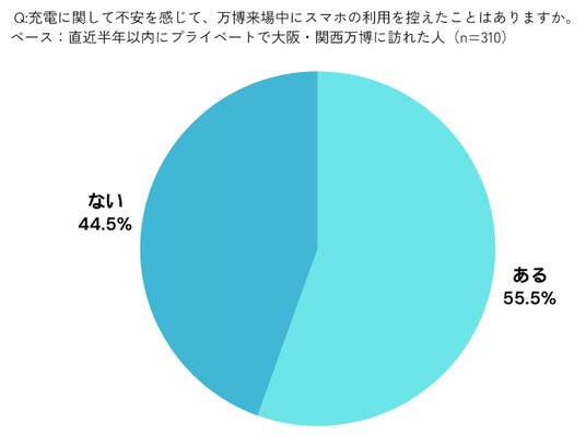 万博来場中に、充電に不安を感じてスマホの利用を控えたことがあるか聞いたところ、半数以上の55.5%が「ある」と回答しました。全回答者が事前の充電対策を行っていると回答していたにも関わらず、結果的に半数以上が来場中に充電の不安を感じていたという実態がわかりました。