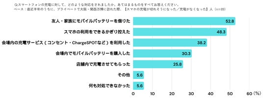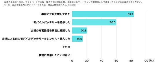 来場前のスマートフォンの充電対策は、「事前にフル充電してきた」と回答した人が83.9%と最多。次いで「モバイルバッテリーを持参した」が60.0%、「会場の充電設備を事前に確認した」が20.3%となりました。回答者全員が事前に何からの対策を行っている結果となり、スマートフォンの充電に対する重要性は、来場者に浸透している様子が伺えました。