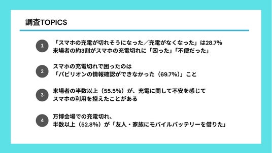 大阪・関西万博が開幕してから1ヶ月が経過した現在、会場内での来場者の充電実態を把握することで、今後の充電環境の提供に役立てることを目的として本調査を実施いたしました。