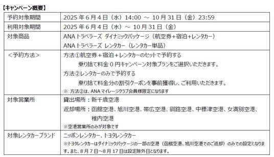 ANA X株式会社(代表取締役社長:神田 真也、本社:東京都中央区、以下「ANA X」)は、2025年6月4日(水)~ 10月31日(金)の期間、「北海道レンタカー乗り捨て料金0円キャンペーン」を実施いたします。新千歳空港でレンタカーを借り、北海道内の他空港でご返却いただくと、通常は最大で17,600円程度かかる乗り捨て料金が無料になります。