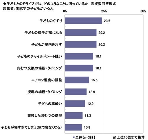また、未就学の子どもがいる方381名に、子どもとのドライブでどのようなことに困っているかを聞いたところ、「子どものぐずり」(23.6%)が最も多く、「子どもの様子が気になる」「子どもが室内を汚す」(いずれも20.2%)、「子どものチャイルドシート嫌い」「おむつ交換の場所・タイミング」(いずれも18.1%)が続きました。