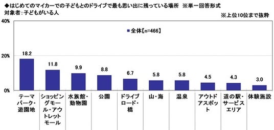 子どもがいる方466名に、はじめてのマイカーでの子どもとのドライブで最も思い出に残っている場所を聞いたところ、「テーマパーク・遊園地」(18.2%)が最も多く、「ショッピングモール・アウトレットモール」(11.8%)、「水族館・動物園」(9.9%)、「公園」(8.8%)、「ドライブロード・橋」(6.7%)が続きました。子どもが喜ぶレジャー施設を目的地にドライブをしたときのことが心に残っている方が多いようです。