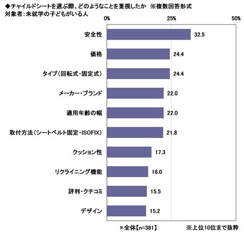 未就学の子どもがいる方381名に、チャイルドシートを選ぶ際、どのようなことを重視したかを聞いたところ、「安全性」(32.5%)が最も多くなりました。子どもの命を守るために十分な安全性を備えていることが欠かせないと考えている方が多いのではないでしょうか。次いで、「価格」「タイプ(回転式・固定式)」(いずれも24.4%)、「メーカー・ブランド」「適用年齢の幅」(いずれも22.0%)となりました。