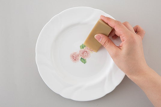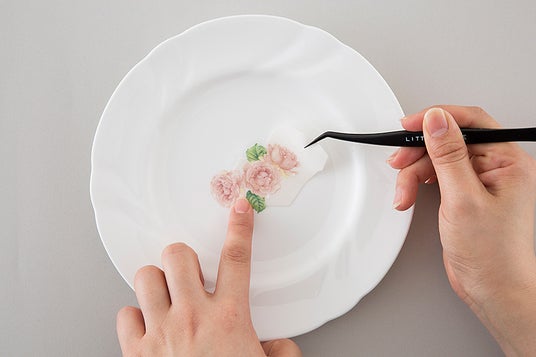 水に浸して台紙から剥がし、白磁に貼り付けて約800度の電気炉で焼成することで、絵柄が定着してオリジナルの食器やインテリア雑貨が制作することができます。