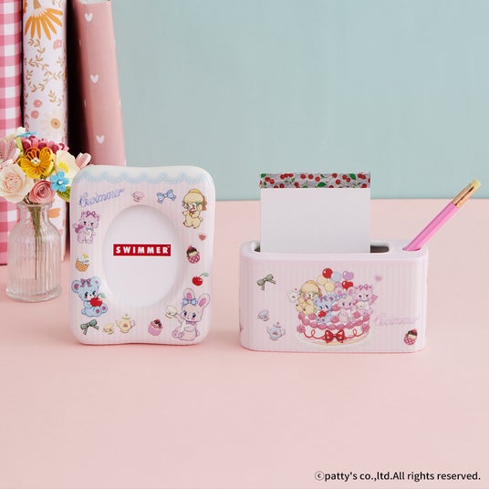 SWIMMERの人気キャラクター、くまの「ハグリー」、ねこの「キャミー」、うさぎの「リバニー」、ひつじの「ラッフィー」たちがパーティーを楽しむ様子がとってもかわいいデザインです(ハート)