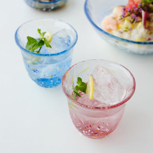本コレクションは、夏の夕焼けから夜へとうつろう空と鮮やかな海という誰もが心惹かれる夏の情景をイメージした「宵茜(よいあかね)」と「蒼凪(あおなぎ)」の2色展開。それぞれのアイテムは、伝統工芸士監修のもと、遠心力を用いた「スピン製法」により、職人が色づけのパウダー配分を細かく調整しながらひとつずつ丁寧に手作りしています。カラフルなガラスが生み出す透明感が食卓に涼やかな印象を添え、料理をさらに美味しそうに引き立ててくれます。