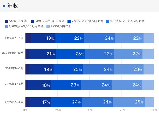 2025年7月~9月度における成約顧客の年収は、特定の年収帯に集中することなく、満遍なく分布している(500万円~700万円未満:17%、700万円~1,000万円未満:24%、1,000万円~1,500万円未満:24%、1,500万円~3,000万円未満:25%)ことがわかりました。年間の推移でも、それぞれの年収帯に大きな変動はみられず、不動産投資に対し幅広い層からの関心が継続していることがうかがえます。