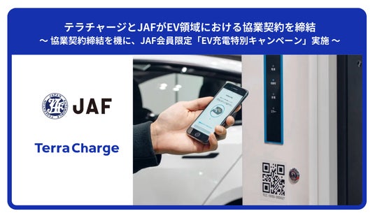 電気自動車(EV)向け充電サービス「Terra Charge(テラチャージ)」を提供するTerra Charge株式会社(本社:東京都港区、代表取締役:徳重 徹、以下「当社」)は、一般社団法人日本自動車連盟(JAF、会長:坂口正芳)とEV充電インフラの拡充およびサービス利便性向上を目的とした協業契約を締結し、2025年12月1日(月)より JAF会員限定「EV充電特別キャンペーン」を実施します。