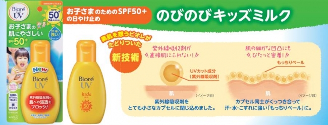 『ビオレ さらさらUV のびのびキッズミルク』です。素肌を想うビオレチームのママ・パパ達が開発した、お子さまのための【SPF50+・PA++++】の日やけ止め。