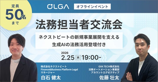 法務オートメーション「OLGA」を提供するGVA TECH株式会社(本社:東京都渋谷区、代表取締役:山本 俊、以下GVA TECH)は、2026年2月25日(水)に、株式会社ネクストビート(本社:東京都渋谷区、代表取締役:三原誠司)にて法務担当者交流会を開催することをお知らせいたします。