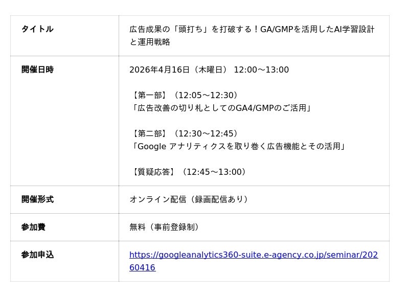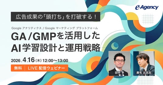 おもてなしを科学する株式会社イー・エージェンシー(東京都千代田区、代表取締役:甲斐真樹、以下イー・エージェンシー)は、2026年4月16日、運用型広告の成果を最大化するための最新戦略を解説するウェビナー「広告成果の『頭打ち』を打破する!GA/GMPを活用したAI学習設計と運用戦略」を開催します。