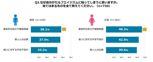 III.セルフエイジズムに陥る要因は、「身体的な衰えや健康問題」が男女ともにTOP