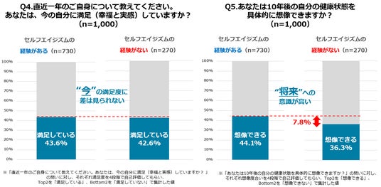 セルフエイジズムの経験者と未経験者を比較すると、「今の自分に満足している」という現在の幸福度には大きな差が見られませんでした。一方、注目すべきは「10年後の自分の健康状態を具体的に想像できますか」という問いに対し、セルフエイジズム経験者の方が7.8%も高い結果を示したことです。この事実は、セルフエイジズムは必ずしもマイナスに働くわけではなく、むしろ自身の健康について考えるきっかけとなっている可能性を示唆しています。