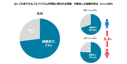 「いい歳して」、「どうせおばさん(おじさん)だから」、「誕生日が来るのが怖い」などセルフエイジズムが原因と思われる言動・体験をしたことがあると回答した人が、73%にのぼることが明らかになりました。特に女性は76.2%と、男性の69.8%を6.4%上回り、女性により強く影響を及ぼす社会課題であることが示唆されています。