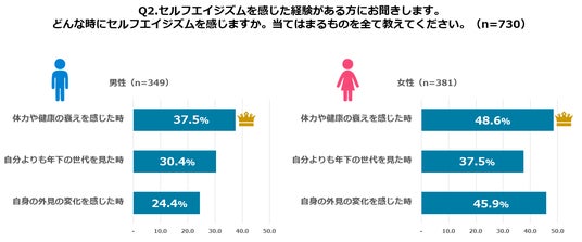 セルフエイジズムの経験者(730名)に、具体的にどのような場面で感じたことがあるかを調査したところ、「体力や健康の衰えを感じた時」が男女ともに最も多く、男性で37.5%、女性で48.6%という結果となりました。上位3位に挙がったものは男女ともに同じであるものの、いずれも女性の方が高い割合を示しており、女性はセルフエイジズムを感じる場面をより多く経験する傾向が明らかになりました。特に、「自身の外見の変化を感じた時」では女性45.9%、男性24.4%と、21.5%の差が見られ、外見の変化に対する受け止め方に大きな違いが表れる結果となりました。