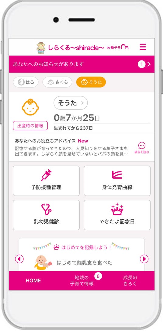 このたび、その一環として母子健康手帳アプリ『しらくる~shiracle~』を導入しました。妊娠中の健康管理から予防接種のスケジュール管理、お子さまの成長記録など気軽にご利用いただけるほか、子育てに関する情報もお届けしてまいります。