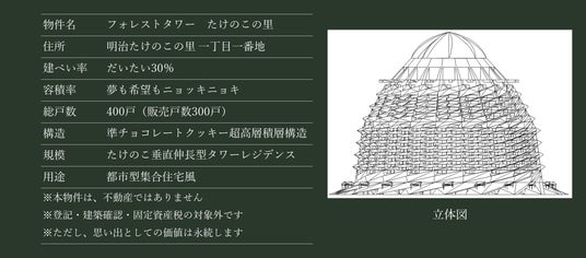 長年親しまれてきた両ブランドは、これまで「きのこ・たけのこ総選挙」などユニークなキャンペーンを展開してきました。2026年3月に分譲された「フォレストヒルズ きのこの山」が「一戸建て」であったのに対し、本企画では「たけのこの里」の形状をモチーフにした「垂直伸長型タワーレジデンス」を展開。「戸建て派 vs タワマン派」という新たな対決構図を、バーチャル空間で具現化しました。