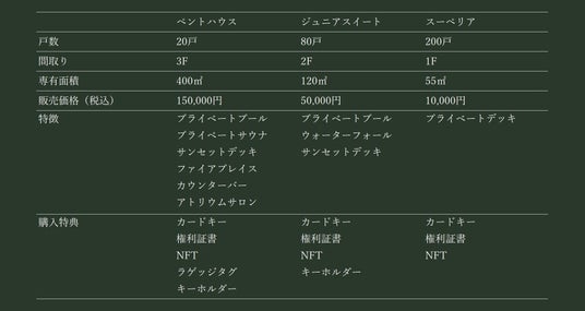 本プロジェクトでは、権利証書にNFTを付与しています。デジタル技術を活用することで、各住戸ごとの「所有権」を明確に証明し、唯一無二の資産として保有していただける仕組みを採用しています。これにより、「たけのこの里に家を持つ」という体験を、価値を伴う所有体験として提供します。