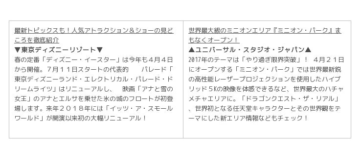 2017年から2018年にかけてオープンする注目スポットの紹介をはじめ、大人気の「東京ディズニーリゾート」と、ミニオンの新エリアに期待が高まる「ユニバーサル・スタジオ・ジャパン」の2大パークを徹底紹介。また、定番人気の10大スポットを詳しくガイドした特集に、水族館・動物園・遊園地など人気のテーマパークから、公園・ミュージアム・体験スポットなどの様々なレジャースポットまで、大ボリュームのカタログは全5ジャンル324スポットを収録!