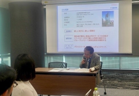 保険の成り立ちから、損害保険業界の全体像とダイレクト型損保の特徴、SBI損保の商品・体制等の概要や強み、注力している取り組み、SBIグループとSBIインシュアランスグループと連携した地方創生の取り組みなどを社長・小野が説明しました。