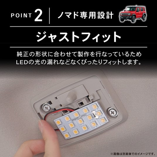 2025年4月3日に発売予定のスズキ「ジムニーノマド(5ドア)」は、すでに5万台の予約注文を受け、現在受注停止となるほどの大人気車種。そのジムニーノマド専用設計のLEDルームランプとなります。