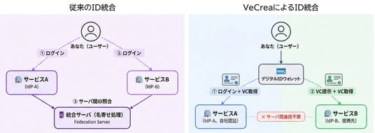 図:従来のID統合とVeCreaによるID統合(概念図)ユーザーの同意とデジタル証明書(VC)の活用により、企業側の名寄せ工程を大幅に削減。