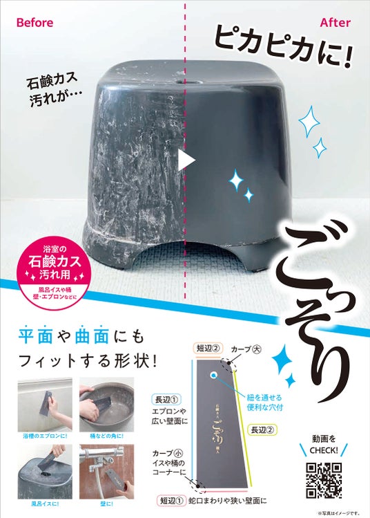 そんな時にあると便利な「石鹸カスごっそり職人」。平面や曲面にもフィットする形状で、長辺は、エプロンや広い壁面に。短辺は、蛇口まわりや狭い壁面に。カーブにも大と小があり、それぞれのカーブでイスや桶のコーナーの細かい汚れまでこそぎ取る!紐を通せる便利な穴付で、使った後はフックなどに吊るして収納を。