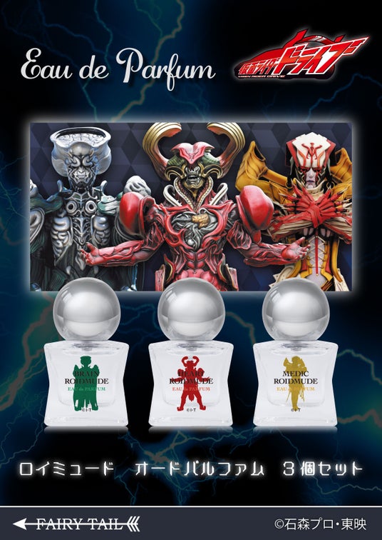 香水の輸入販売を手がけるフェアリーテイル株式会社(東京都港区)は、放送開始から10周年を迎えた『仮面ライダードライブ』より、ロイミュードのハート、ブレン、メディックをイメージした香水のSETを発売します。