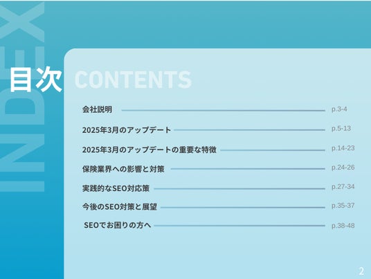 株式会社ベクトル(本社:東京都港区、代表取締役会長兼社長:西江 肇司、東証プライム:6058)の子会社であるOwned株式会社(東京都品川区、代表取締役社長、石井翔、以下「当社」)は、保険業界向けに「Googleアップデートによる分析レポート」の2025年3月版(全48ページ)を無料公開いたしました。