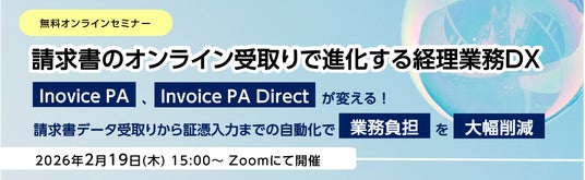 株式会社ニーズウェル(本社:東京都千代田区、代表取締役社長 松岡 元)は、2026年2月19日(木)15時より、無料オンラインセミナー「請求書のオンライン受取りで進化する経理業務DX ~「Invoice PA」、「Invoice PA Direct」が変える!請求書データ受取りから証憑入力までの自動化で請求書処理の業務負担を大幅削減~」を開催します。